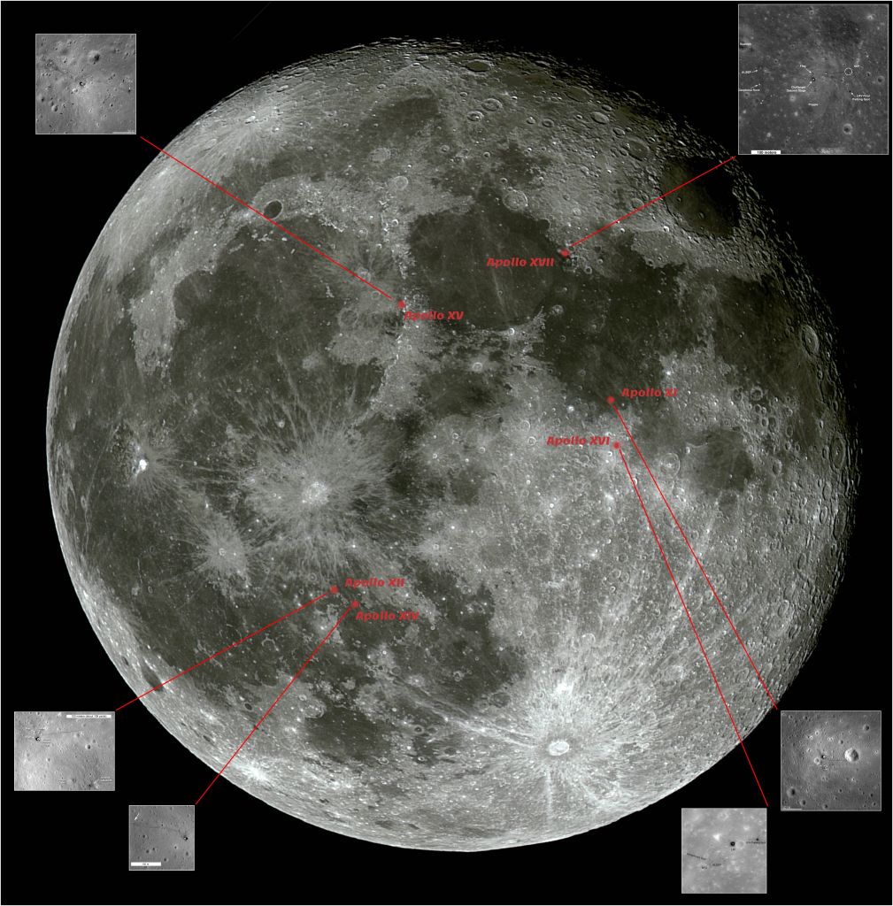 En la imagen he señalado los lugares (más o menos) donde alunizaron o aterrizaron las distintas misiones Apollo (que ahora se puede decir de los dos modos).