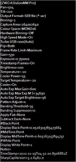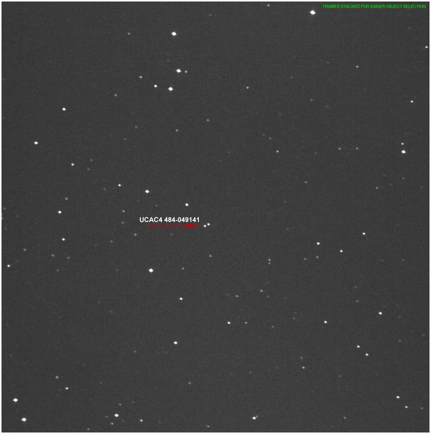 La magnitud de la estrella a ocultar, es de 13.6 y como se puede ver, se uso una ganancia de 530 junto con una exp. de 0.750 ms, permitiendo estos valores obtener estrellas de Comparación/Guías y la estrella a ocultar. La noche tuvo algunas rachas de viento fuerte, dificultando en algunos momentos mantener la posición de las estrellas estaticas en el mismo sitio, afortunadamente, durante los escasos segundos que duro la ocultación, no hubo rachas fuertes.