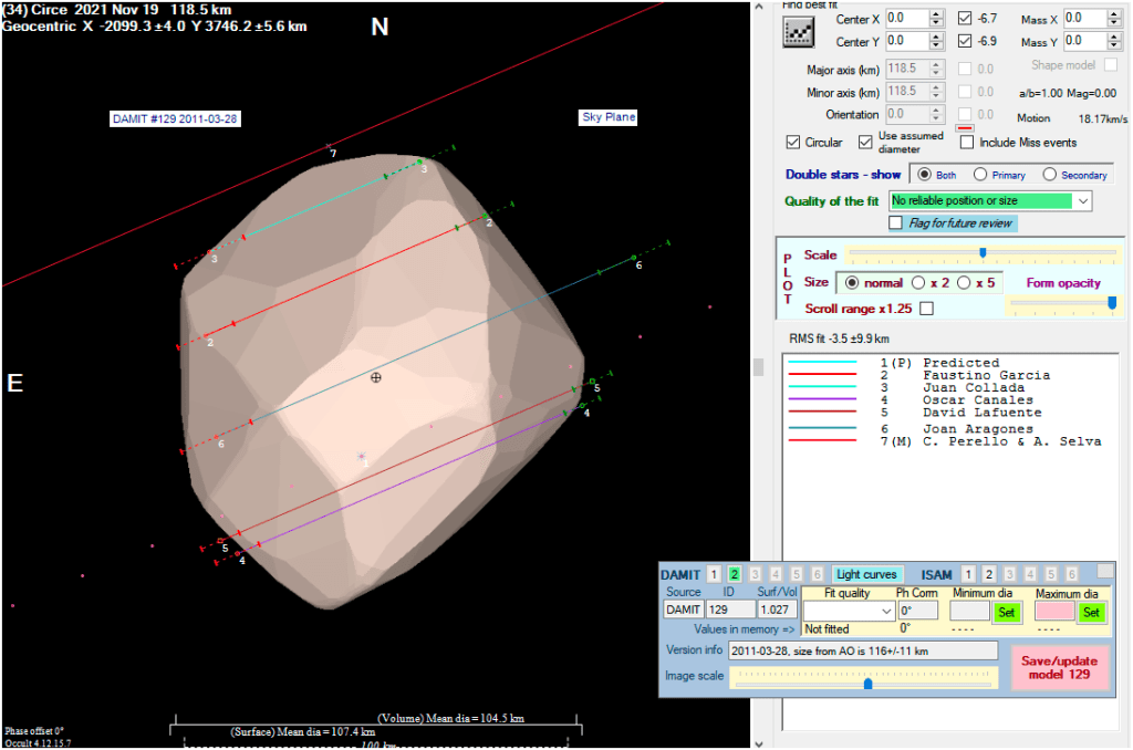 La ocultación fue realizada por varios observadores, situados en diferentes puntos de la península Ibérica, el resultado de las diferentes observaciones se presenta en la imagen de la derecha, en la cual se pueden las cinco cuerdas positivas y una negativa. Todas las cuerdas están dentro de los umbrales de incertidumbre. El modelado del asteroide fue hecho por Faustino García.