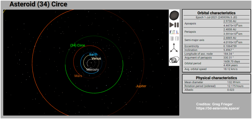 Circe (34) pertenece al cinturón de asteroides, su orbita esta a una distancia media del Sol de 2,688 UA y fue descubierto por Jean Chacornac el 6 de Abril de 1855 desde el observatorio de Paris.