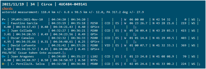 | Resultado | Asteroide | Estrella | Comienzo | Fin | Duración | Duración Max | Latitud | Longitud | Altura | Temperatura | Localización |