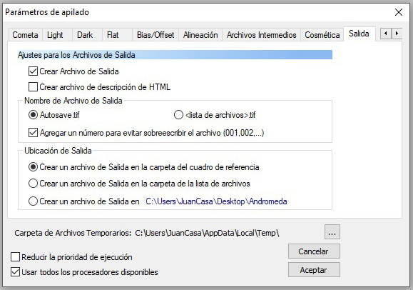 En esta pestaña, «Salida» podremos escoger si creamos automáticamente un archivo de salida al terminar de apilar. Normalmente le dejaremos que lo nombre Autosave.tiff, también le podemos seleccionar donde lo debe de guardar.