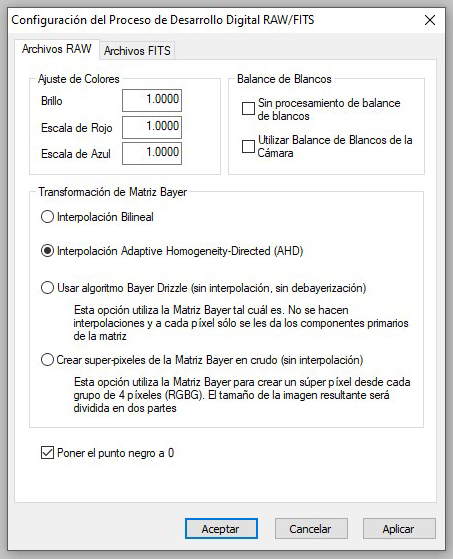 Una vez terminado con el campo «Ajustes», pasemos ahora al siguiente campo, «Configuración Raw/FITS DDP…», este abrirá una ventana en la cual podremos escoger tipo de archivo de imagen con los que trabajamos, ya que si usamos cámara Réflex los archivos serán Raw pero si usamos cámaras dedicadas a astronomía, normalmente trabajan con formato FITS.
