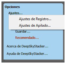 «Ajustes recomendados» nos dará una serie de ajustes, que DSS recomienda seleccionar y depende del formato y otros parámetros de las imágenes que deseamos apilar. Unas ya están escogidas por defecto y figuran en verde y otras las podremos activar si lo deseamos… estas últimas, figuran en rojo.