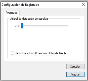 Si escogemos la opción «ajustes de Registro» se nos abrirá una nueva ventana llamada «Configuración de registrado», en la cual podremos cambiar el umbral de detección de estrellas, mediante un deslizador.