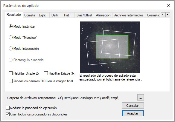 La primera pestaña «Resultado» nos permite escoger la forma en que nos entregara la imagen final, una vez apilada, es conveniente jugar con las distintas posibilidades para ver cual nos parece más interesante, ya que dependiendo de cual escojamos, nos entregará una imagen en la que puede salir toda la superficie de la imagen o una parte de ella.