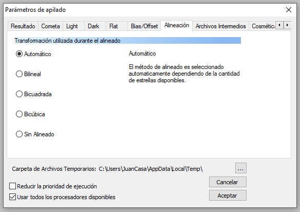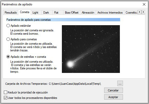 En la pestaña «Cometa», podremos escoger el tipo de apilado para estos objetos, ya que al tener un movimiento bastante elevado en referencia a las estrellas que hay en el fondo, debemos decidir si queremos nítidas las estrellas, el cometa o ambos.